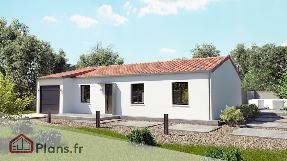 Maison traditionnelle de plain-pied (premier Prix, familiale) de 68 ร  100 m2. Forme du plan : rectangulaire