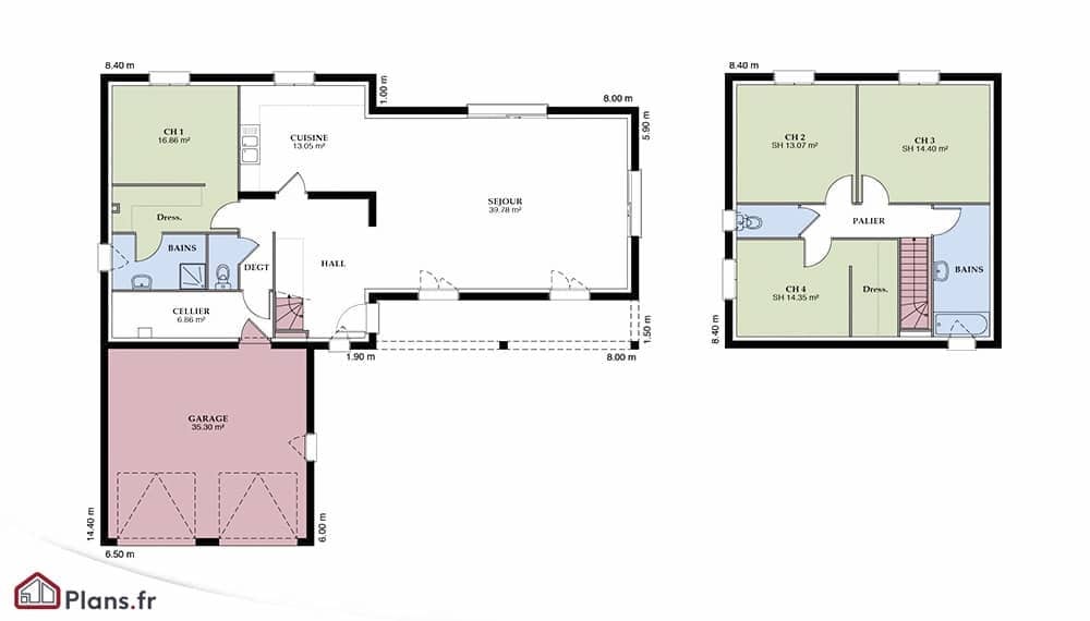 Maison traditionnelle à étage (haut de gamme, résidence secondaire) de 135 à 145 m2. Forme du plan : Plan en L