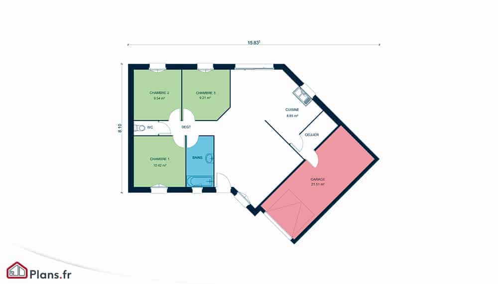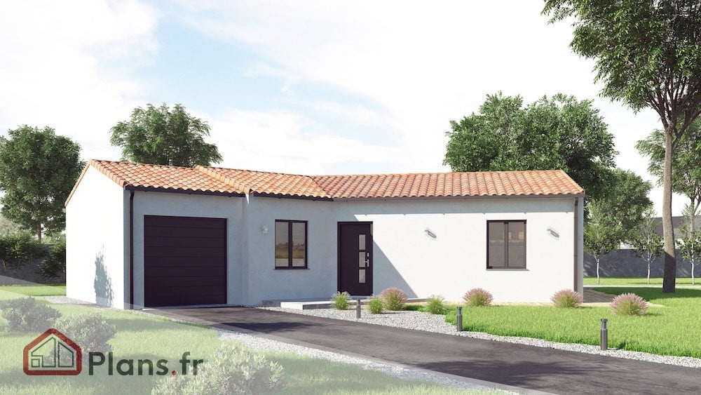 Maison traditionnelle de plain-pied (premier Prix, familiale) de 75 ร  90 m2. Forme du plan : plan en v